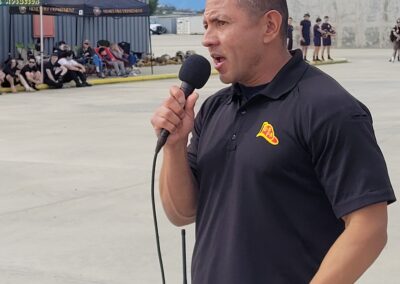 Following team physical warmups by Robin Leafblad from Santa Ana College, CSFA President Eddie Sell, himself a former Fire Explorer, welcomed the students and their advisors to the beginning of the six-hour event.