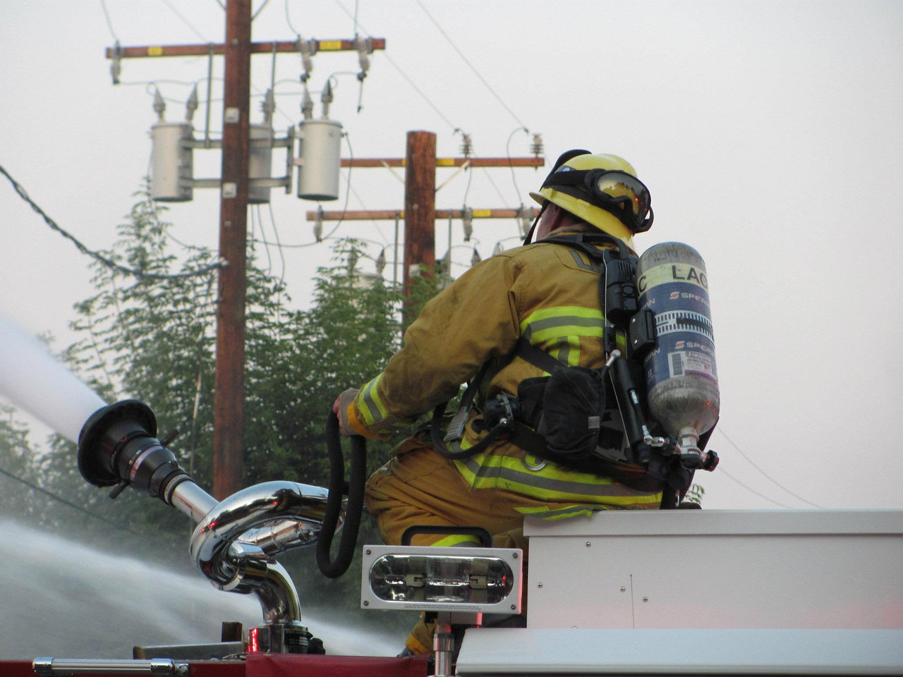Be extremely cautious when using water to fight fires near power lines. If you must use water, use a mist, or fog pattern, never a stream.