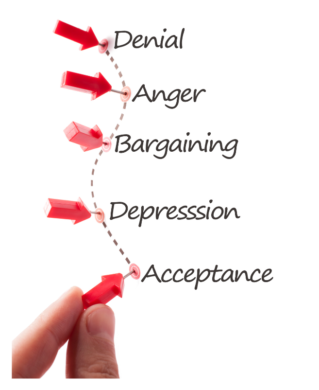 What unites all these experiences is that coming back from any loss is a process. Grief is an emotion, but grieving is processing that emotion. Psychologists often refer to the five stages of grief. Did you know these stages were adapted from Elisabeth Kubler Ross’ five stages of dying? They are: