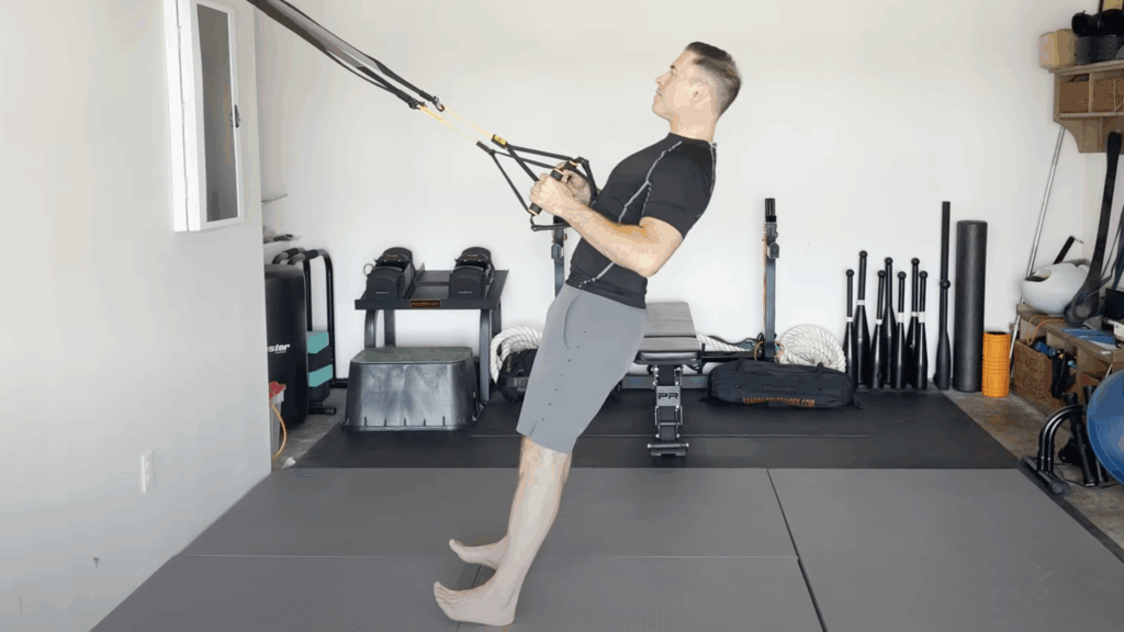 - Flex your arms pulling your body into the straps until your elbows are on your ribs